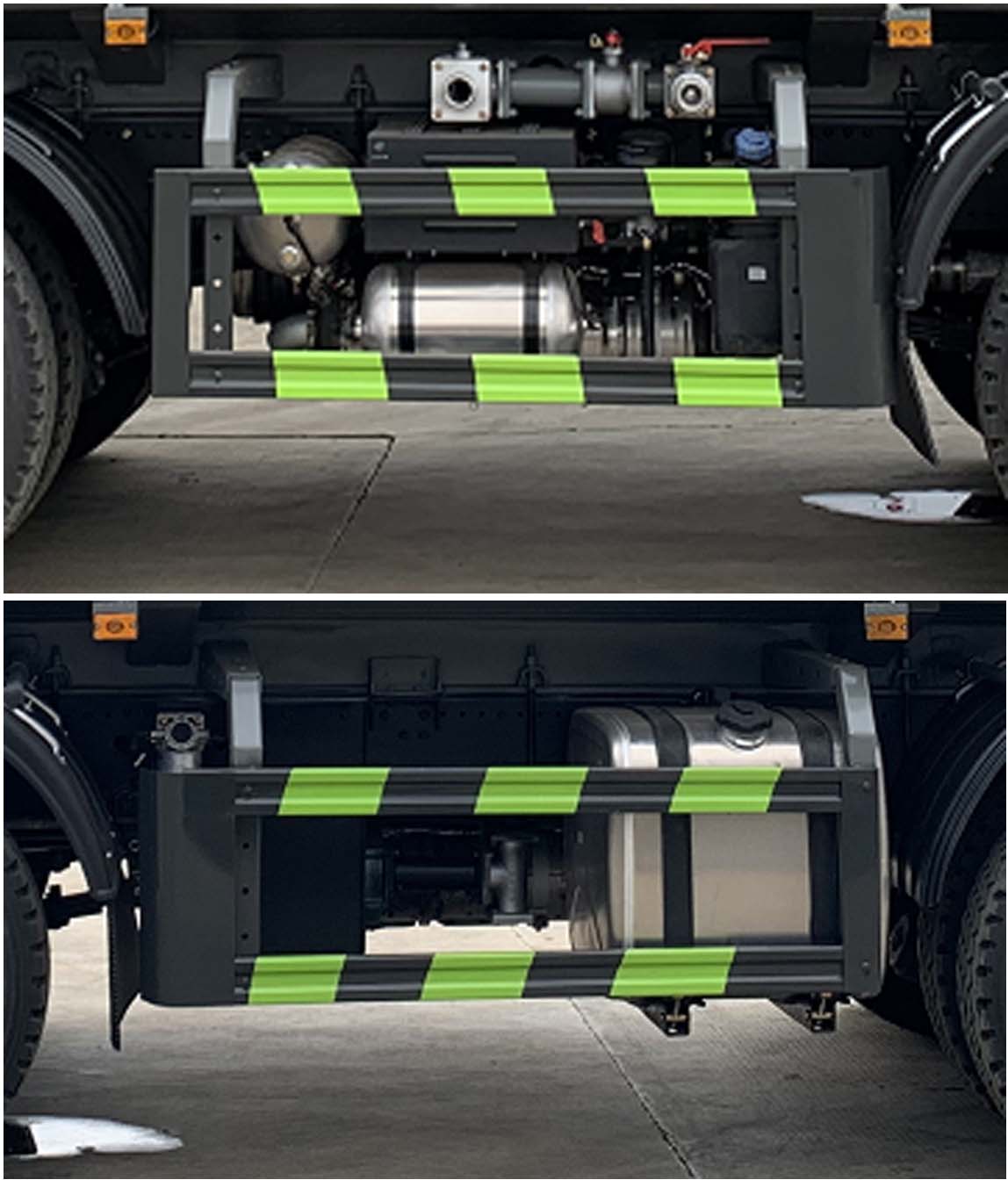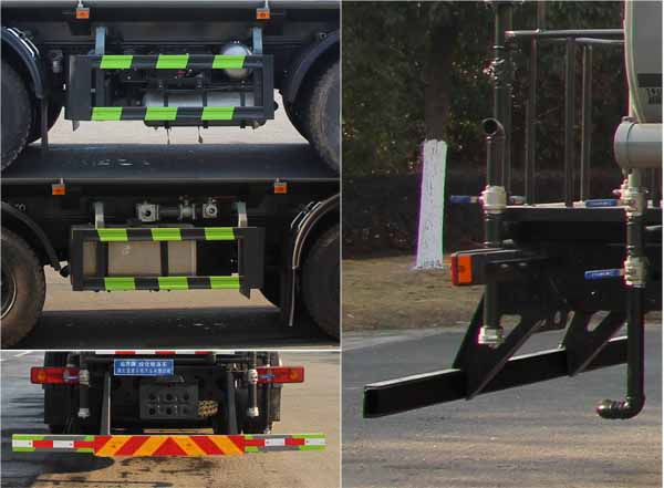 該車主要用于城鄉園林綠化噴灑;主要裝置為罐體及噴灑裝置:罐體總容量:20.1立方米;罐體有效容積:19.14立方米;罐體外形尺寸(長×長軸×短軸)(mm):7300×2450×1650;側、后防護材料均為:Q235碳鋼,連接方式均為:螺栓連接,后部防護截面尺寸(mm):120×50,后部防護離地高度(mm):490;ABS的型號及生產廠家:3631010-C2000/東科克諾爾商用車制動系統(十堰)有限公司,J ABS/焦作博瑞克控制技術有限公司.隨底盤選裝駕駛室,選裝噴霧裝置樣式,選裝箭頭指示燈裝置,選裝自動球閥安裝位置,選裝水炮支架位置,選裝擋泥板樣式,僅采用軸距(mm):1850+3200+1350改裝.隨底盤選裝空濾尿素罐/電瓶框位置布局,選裝不帶高位花灑裝置。