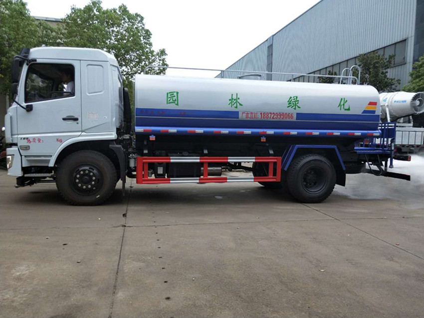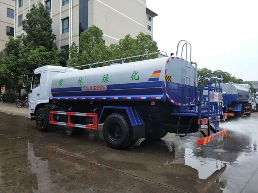 東風灑水車罐體采用碳鋼板制作,罐體內做防銹處理,功能:前沖后灑、罐體后帶工作平臺,平臺上安裝綠化灑水高炮,可多種雨狀調節(大雨、毛毛雨,霧狀),配備灑水泵,泵可自吸自排,帶自流閥,帶消防接頭,帶過濾裝置。