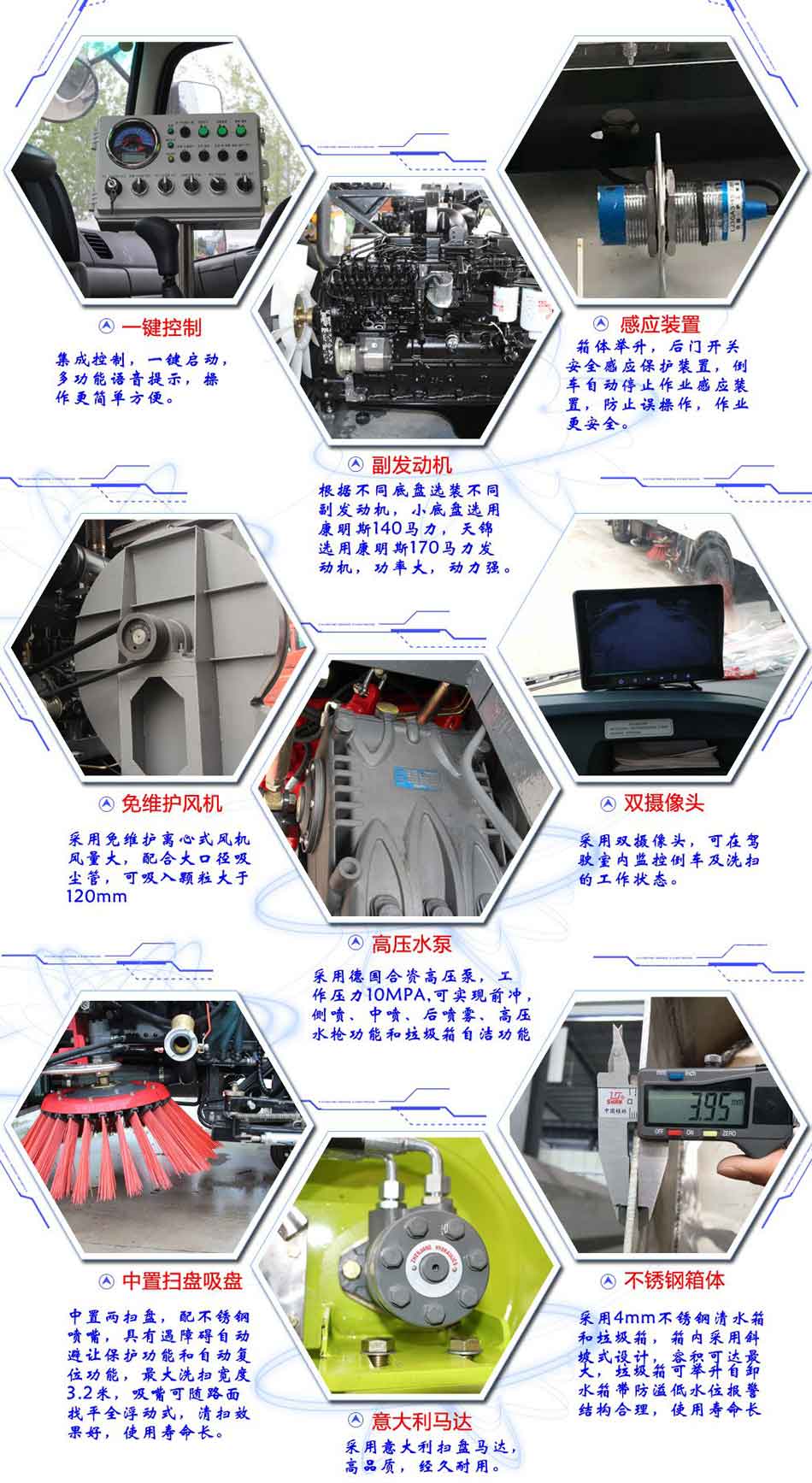 東風(fēng)D9洗掃車上裝配置:帶不銹鋼箱體,容積為9立方,帶2個(gè)中置掃盤,康明斯170馬力副發(fā)動(dòng)機(jī);意大利馬達(dá);德國(guó)高壓水泵(前沖/側(cè)噴/中噴/后噴霧/沖洗水槍/垃圾箱自潔裝置);萬向高壓路沿清洗噴頭,威龍低壓泵(前沖);不銹鋼垃圾箱;不銹鋼管高壓管路;德國(guó)控制器;韓國(guó)控制箱;PLC一鍵控制;尾部LED箭頭燈;機(jī)油、垃圾箱、水箱均帶防溢低水位報(bào)警裝置;倒車及洗掃狀態(tài)室內(nèi)監(jiān)視器。18m高壓沖洗卷盤。清掃寬度3.5m;清洗壓力10MPa;吸入粒度φ110mm。
