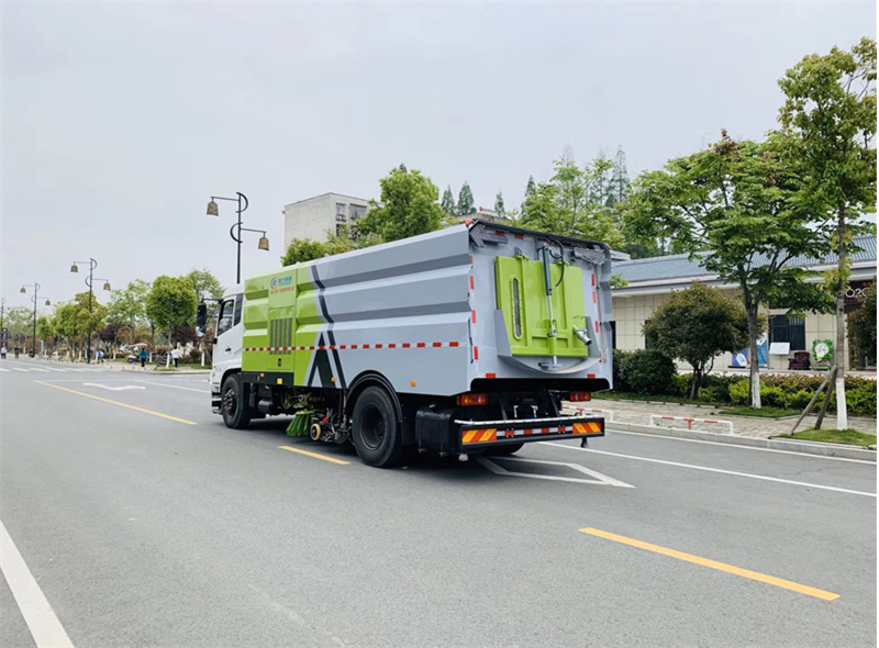 Ø 洗掃車采用東風天錦DFH1180EX8型國六二類汽車底盤改裝,加裝副發動機、風機、高壓水泵、清水箱、垃圾箱、左右立掃、帶噴水桿的寬吸嘴、低壓沖洗系統、掃盤降塵系統、液壓系統、專用裝置電控系統和副車架等改裝而成。