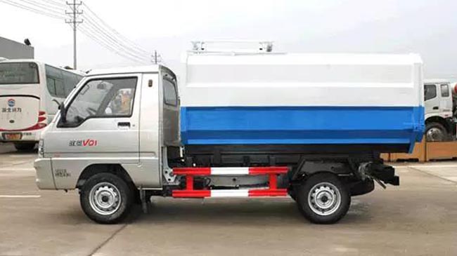 箱體容積2~3立方米,全密封式垃圾箱體,采用碳鋼邊三底四焊接制作,邊板折彎強化,箱體右側(cè)配液壓掛桶提升機,國產(chǎn)油泵、多路閥、取力器、油缸,卸料方式為底部雙杠液壓舉升自卸,駕駛室外操作,鐵桶掛架,后門機械鎖緊,手動開門,可選液壓開門。