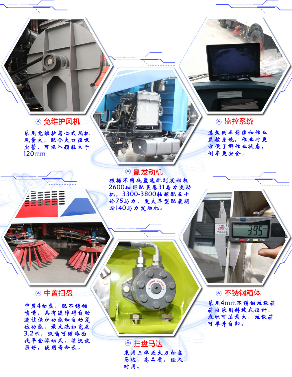 此車為道路洗掃專用車輛,專用裝置為掃刷.防護裝置均采用Q235A材質,均采用焊接連接, 專用裝置掃刷代替部分側面防護,掃刷離地高為(mm):180,后下部防護與車架焊接連接, 后下部防護尺寸:50×150(mm),離地面高度420mm. ABS系統型號為XH-KQ4S4M-E01, 生產企業為廣州市西合汽車電子裝備有限公司;型號為CM4XL-4S/4M, 生產企業為廣州瑞立科密汽車電子股份有限公司.整車長/軸距對應關系為(mm):7590/4200,7890/4500, 8090/4700,8590/5200,8990/5600,4700/8310,5200/8680.選裝不同的外觀圖片.隨底盤選裝駕駛室. |