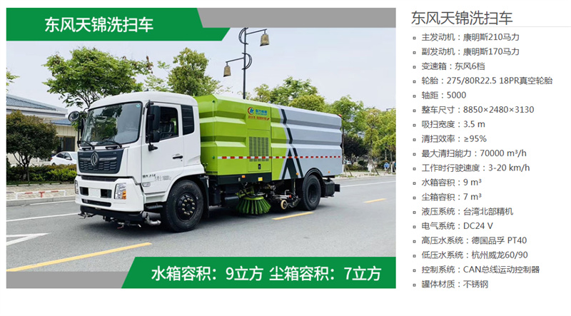 東風(fēng)18噸洗掃車,帶2個中置掃盤,天錦為康明斯170馬力副發(fā)動機;三洋馬達;高壓水泵(前沖/側(cè)噴/中噴/后噴霧/沖洗水槍/垃圾箱自潔裝置);高壓路沿清洗噴頭,低壓泵(前沖);不銹鋼垃圾箱;控制器;控制箱;PLC一鍵控制;尾部LED箭頭燈;垃圾箱、水箱均帶防溢低水位報警裝置;倒車及洗掃狀態(tài)室內(nèi)監(jiān)視器。20m高壓沖洗卷盤。
