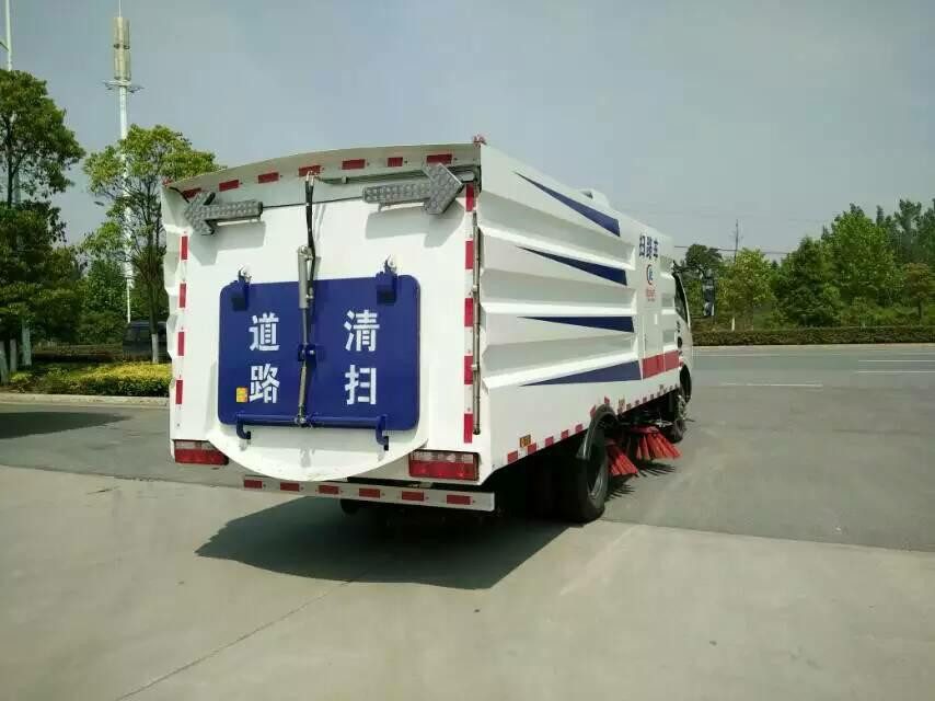 該掃路車采用東風多利卡型國五二類底盤改裝,加裝副發動機、風機、清水箱、垃圾箱、左右立掃、后置吸盤,掃盤降塵系統,液壓系統、專用裝置電控系統和副車架等改裝而成(可加裝前沖后灑)