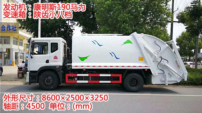 東風(fēng)T5壓縮式垃圾車,T5加寬駕駛室,4×2驅(qū)動,發(fā)動機康明斯190馬力,陜齒小8檔變速箱,軸距4.5米,前橋5噸,后橋10噸,10.00R20鋼絲胎,帶有ABS,方向助力。